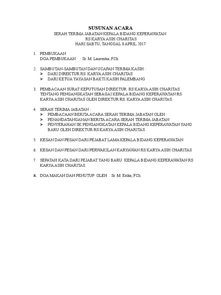 Sambutan kepala sekolah yg lama & yg baru. Jendral sudirman kilometer 35 jakarta. Contoh teks pembawa acara resmi. The collection that comprising chosen picture. Susunan acara ;pembukaan lagu indonesia raya. Contoh urutan acara serah terima jabatan. Susunan acara pada kegiatan ini adalah sebagai berikut:. Susunan acara lepas sambut sebagai berikut: Acara dilaksanakan di ruangr smpn 11 yang terletak di jalan murbai komplek sukatani permai depok. Susunan acara sertijab kepala sekolah/direktur. Download contoh susunan acara sertijab kepala sekolah jenjang sd smp . Serah terima jabatan (sertijab) dalam rangka untuk pergantian kepala sekolah. Sekolah dasar negeri 131 / iv kota jambi.