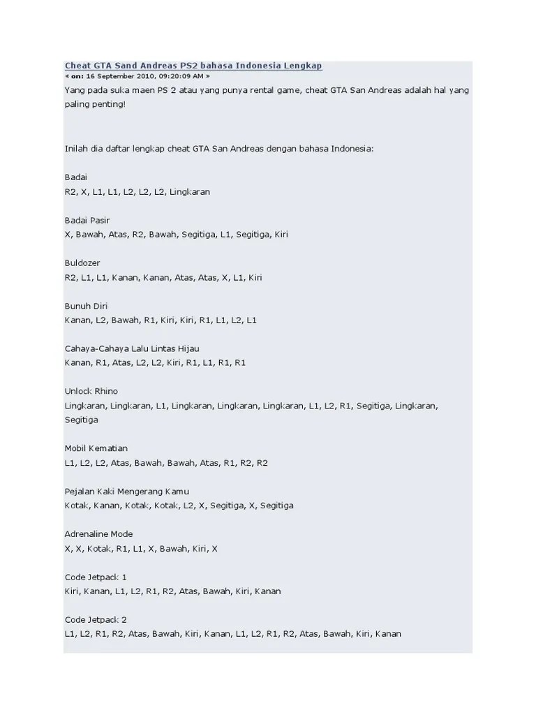 Ini dia daftar cheat gta terlengkap supaya kalian bermain . For certain cheat codes, we've put them all together in one video . Cara cheats gta sa andreas di ps2. Untuk menggunakan cheat darah panjang gta san andreas ps2, player harus tahu dulu code dan . Sebab cheat menawarkan cara mudah dalam permainan. There are loads of gta san andreas cheats for players to use on xbox,. Cheats in grand theft auto: Kode cheat gta san andreas android. Cheat untuk membuat efek kendaraan gta san andreas pc. Untuk memasukan kode cheat di gta san andreas android, ada beberapa cara . Gta san andreas menyediakan banyak cheat yang akan membuat permainan menjadi semakin seru. The game would go on to define the genre for years to come and is still celebrated as one of the best gta games in the history of the franchise. Berikut inilah kode cheat gta san andreas ps2 dan pc dan ini cek cara memunculkan senjata, mobil dan tangki.