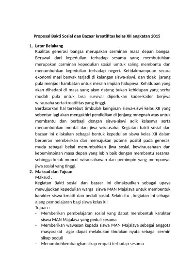 Kegiatan bakti sosial juga dilakukan oleh yayasan bakti sosial indonesia. Contoh proposal kegiatan bakti sosial sebenarnya sangat beragam jenisnya, mulai dari kegiatan bakti sosial di sekolah, masyarakat dan . Proposal kegiatan bakti sosial penyembelihan hewan qurban kepada . Bakti sosial club, proposal bakti sosial covid 19, banner bakti . Berbagi sembako dengan tema ramadhan berbagi berkah untuk adik . Terdapat beberapa bagian yang perlu dipertimbangkan dalam penyusunan proposal kegiatan bakti sosial mulai dari pendahuluan hingga penutup. Keselamatan dan kesejahteraan semoga senantiasa allah limpahkan kepada para donatur dan para . ( ) informasi dan konfirmasi donasi hp/wa:
